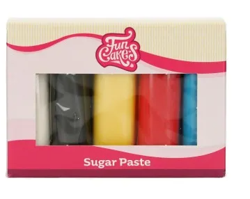 De FunCakes rolfondant multipack primaire kleuren bevat witte, gele, rode, blauwe en zwarte fondant en heeft een heerlijke vanille smaak